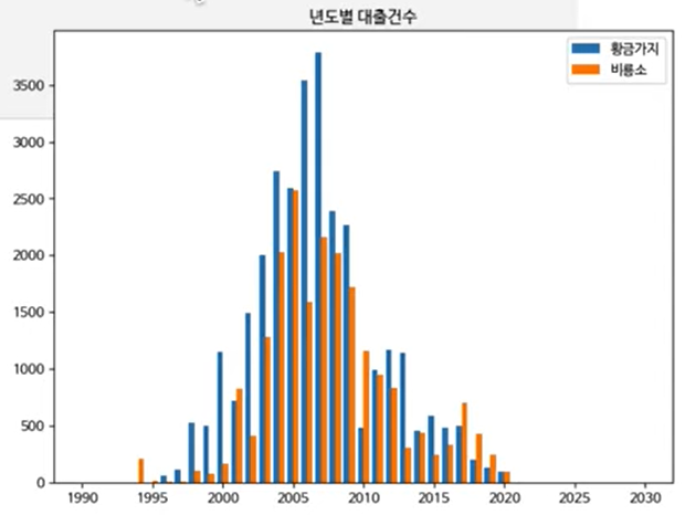 ax.bar(line1['발행년도'] - 0.2, line1['대출건수'], width = 0.4, label = '황금가지')